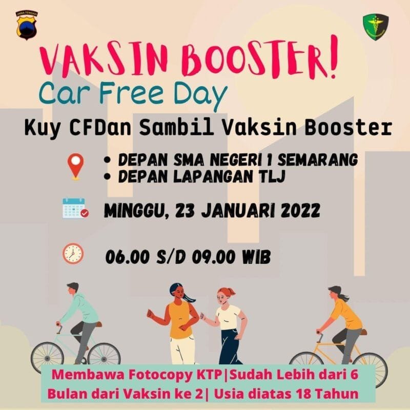 SEMARANG-Bidang kedokteran dan kesehatan (Biddokkes) Polda Jateng akan gelar vaksinasi Booster massal pada kegiatan Car Free Day di Kota Semarang.