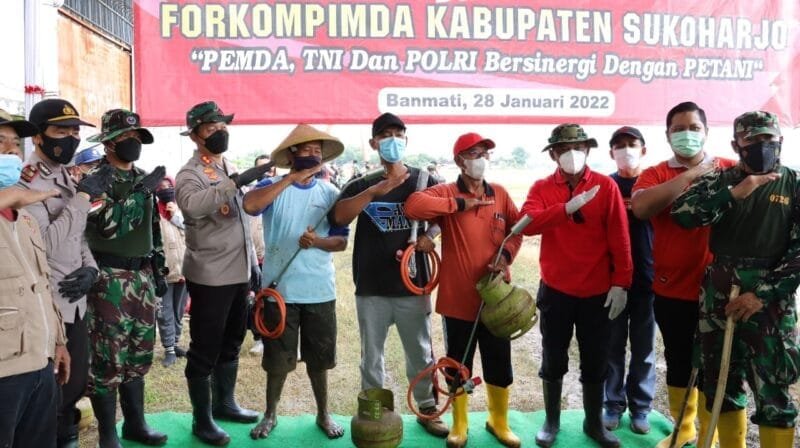 Sukoharjo – Kolaborasi nyata dan luar biasa dilakukan antara Pemerintah Daerah Sukoharjo, Kodim 0726 Sukoharjo dan Polres Sukoharjo dalam membantu petani menanggulangi hama melalui kegiatan gropyokan tikus di Area Persawahan Banmati, Sukoharjo, Jumat (28/1/2022).