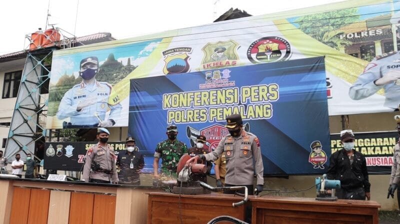 Dalam gelaran konferensi pers di Kantor Satlantas Polres Pemalang, Senin (6/2/2022), Kapolres Pemalang AKBP Ari Wibowo mengatakan, knalpot brong tersebut diamankan oleh petugas dari sejumlah 378 pengendara yang melakukan pelanggaran penggunaan knalpot saat melintas di jalan protokol wilayah Kabupaten Pemalang.