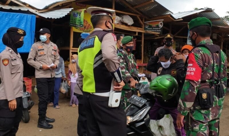 Banjarnegara – Polres Banjarnegara Bersama TNI Kodim 0704/ Banjarnegara dan Satpol PP Kabupaten Banjarnegara bersinergi melakukan upaya mencegah penyebaran virus covid-19 dengan Operasi Yustisi kampanye protokol kesehatan, pembagian masker gratis kepada Masyarakat di Wilayah Banjarnegara, Minggu (27/3/2022).