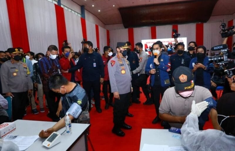 Jakarta – Kapolri Jenderal Listyo Sigit Prabowo meninjau secara langsung kegiatan akselerasi vaksinasi yang diselenggarakan bersama dengan elemen mahasiswa, BEM dan Organisasi Kepemudaan (OKP) di Gelanggang Olahraga Universitas Trisakti, Jakarta, Selasa (29/3/2022).