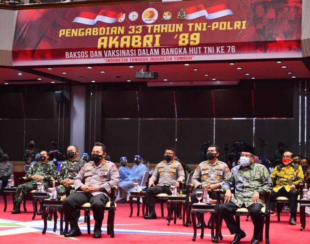 Ketua MPR Bambang Soesatyo, Panglima TNI Marsekal Hadi Tjahjanto dan Kapolri Jenderal Listyo Sigit Prabowo meninjau langsung kegiatan serbuan vaksinasi dan bakti sosial yang diselenggarakan oleh Akabri 89 di Gedung Gatot Soebroto Mabes TNI, Cilangkap, Jakarta Timur, Rabu (13/10/2021).