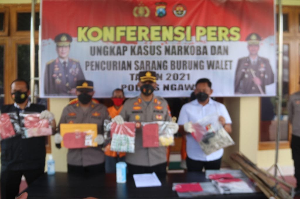 Dari kejadian tersebut Satreskrim Polres Ngawi berhasil mengamankan barang bukti berupa 2 (dua) potongan bambu beserta tali karet pengikat, 1 (satu) plastik kecil yang berisi sisa sarang Burung Walet, 1 (satu) buah flashdisk yang berisi rekaman CCTV, 1 (satu) buah kaos Putih yang bertuliskan Djakarta, 1 (satu) HP Nokia warna hitam biru, 1 (satu) unit sepeda motor Honda Mio warna Merah Tahun 2010 No. Pol AE-4010-JAB, Noka : MH3260305AK273756, Nosin : 28D2276194 beserta STNK dan Kunci Kontaknya, 1 (satu) HP Nokia warna Hitam, 1 (satu) buah scrap besi, 1 (satu) buah jangkar besi, 1 (satu) buah tali tampar warna Putih dan 1 (satu) buah senter kepala.