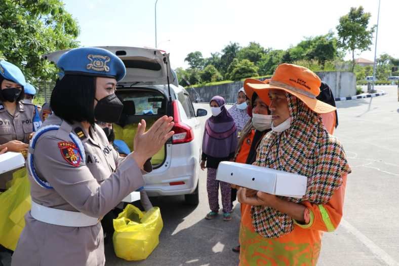 Terlihat puluhan Polisi Wanita membagikan puluhan takjil kepada pengendara yang melintas dan kepada petugas kebersihan atau pasukan orange.