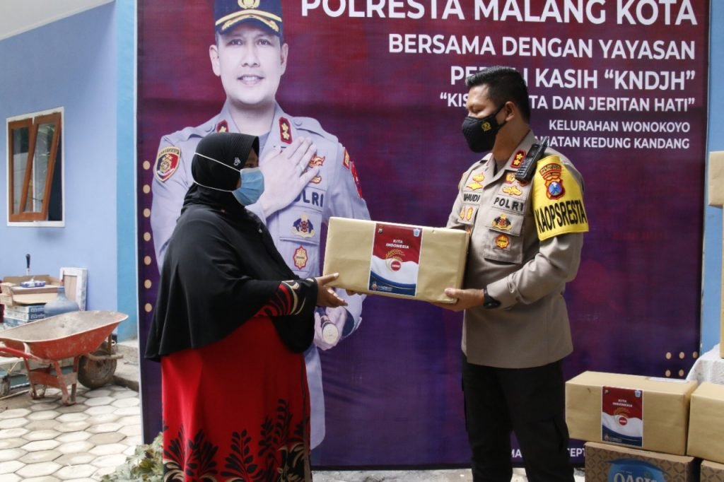 Selain melaksanakan vaksinasi Covid-19 door to door, Polresta Malang Kota juga memberikan bantuan kepada Yayasan Peduli Kasih KNDJH. Bantuan yang diberikan adalah sembako, peralatan mandi, makanan ringan, dan obat-obatan. (*)