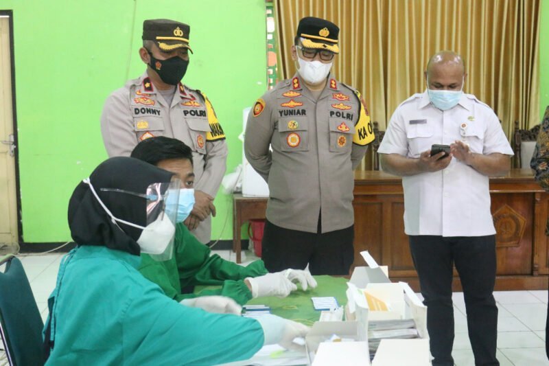 KENDAL – Kapolres Kendal AKBP Yuniar Ariefianto yang peduli dengan kesehatan penerus bangsa melaksanakan kunjungan posko sekolah sehat yang berada di MAN Kendal. Selain itu Yuniar juga monitoring swab anti gen yang dilaksanakan di MAN Kendal sebagai persiapan PTM.