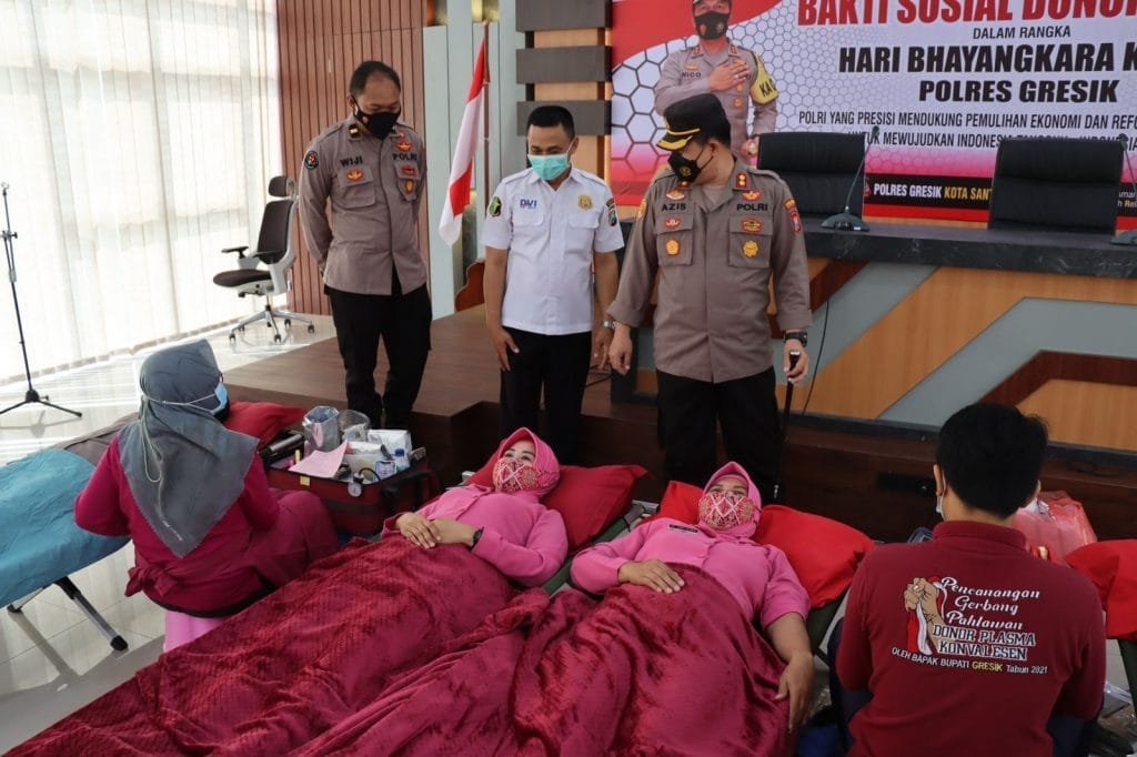 Kapolres Gresik AKBP Mochamad Nur Aziz menuturkan, kegiatan donor darah dalam rangka menyambut Hari Bhayangkara ke 76. Donor darah digelar di Aula Wicaksana Leghawa Polres Gresik, Rabu (08-06-2022).