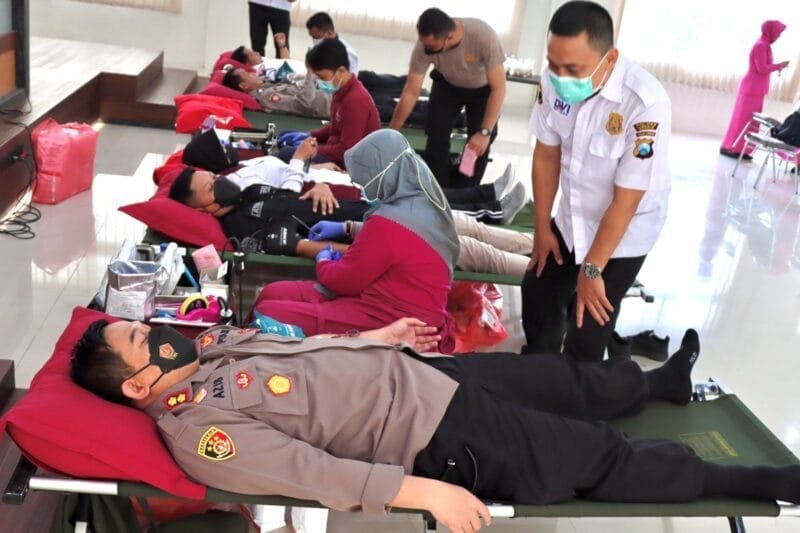 Kapolres Gresik AKBP Mochamad Nur Aziz menuturkan, kegiatan donor darah dalam rangka menyambut Hari Bhayangkara ke 76. Donor darah digelar di Aula Wicaksana Leghawa Polres Gresik, Rabu (08-06-2022).