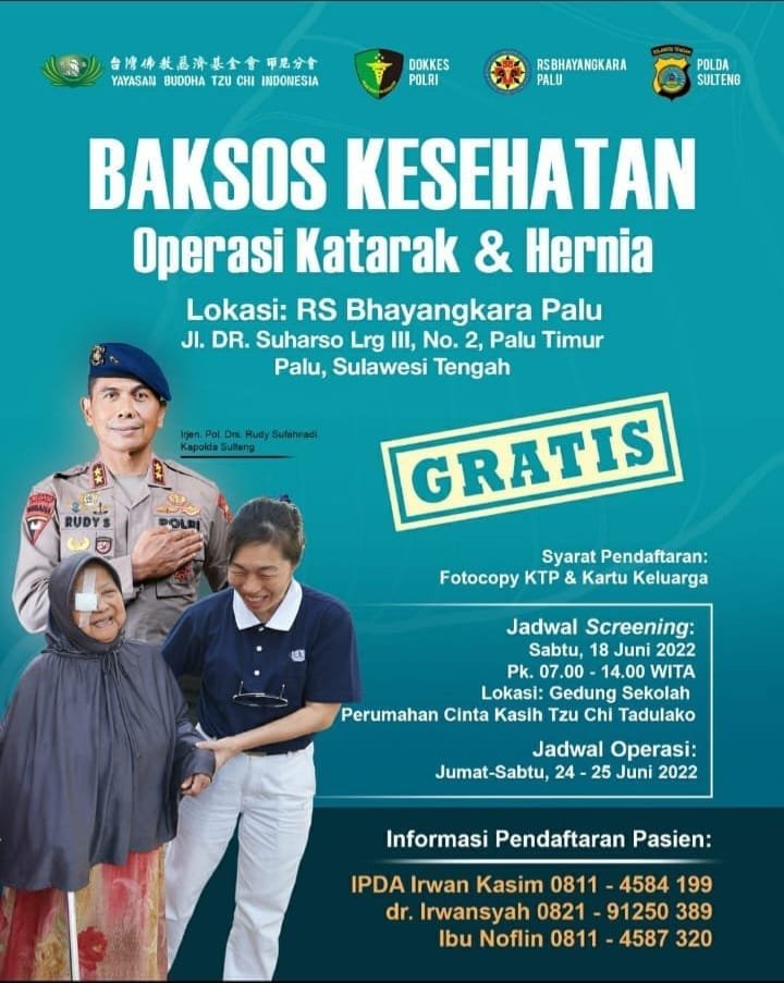 “Polda Sulteng akan menggelar Bakti sosial kesehatan operasi katarak dan hernia, terbuka untuk masyarakat umum dan gratis. Kegiatan ini dalam rangka Hari Bhayangkara ke-76 tahun 2022,” ungkap Didik melalui pesan whatsapp yang dibagikan kepada media, Rabu (15/6/2022)