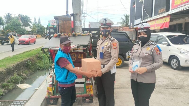 Pringsewu LensaPolri.com – Puluhan warga yang berprofesi sebagai pengayuh becak yang beroperasi di sepanjang ruas jalan protokol kota Pringsewu mendapatkan bantuan paket sembako dari satuan lalu lintas Polres Pringsewu.