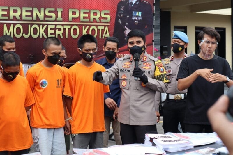 “Sebagai Credit Marketing Officer atau Surveyor PT Mega Finance Nanda Agus Dwi Prasetya (24) warga Kelurahan Sengon, Kecamatan Jombang, Kabupaten Jombang. Bersama sembilan pelaku lainnya, dari data keseluruhan yang di input terdapat 77 konsumen yang masuk dalam analis survey para pelaku. Terdapat 62 konsumen (PK) yang mengalami keterlambatan pembayaran dengan total ada empat dealer”, Ucap Kapolresta Mojokerto