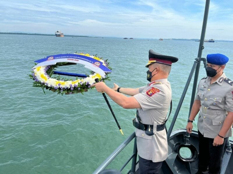 Kegiatan upacara tabur Bunga di kapal Polisi Prahasta-7015 Korpolairud Baharkam Polri di pelabuhan semayang Balikpapan dan upacara ziarah di Taman Makam Pahlawan Dharma Agung Balikpapan adalah satu rangkaian pembinaan tradisi dalam rangka pringatan Hari Bhayangkara ke-76 yang di laksanakan Polda Kaltim.