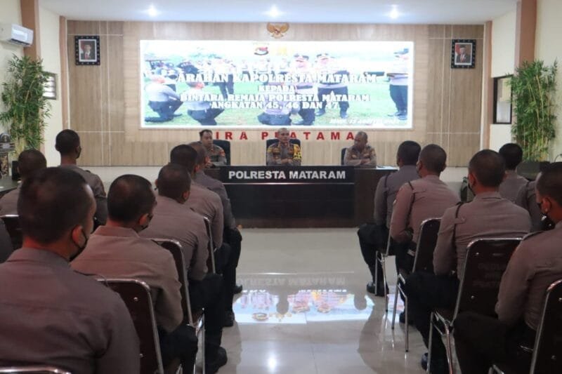 LENSAPOLRI.COM, MATARAM – Kapolresta Mataram Kombes Pol Mustofa SIK MH sebagai pimpinan dalam mengemban fungsi pembinaan memberikan arahan kepada Bintara Remaja Angkatan 45, 46 dan 47, selepas kegiatan tradisi pembaretan pada Sabtu, (13/08) yang lalu bertempat di Gedung Wira Pratama Polresta Mataram. Senin, (15/08)