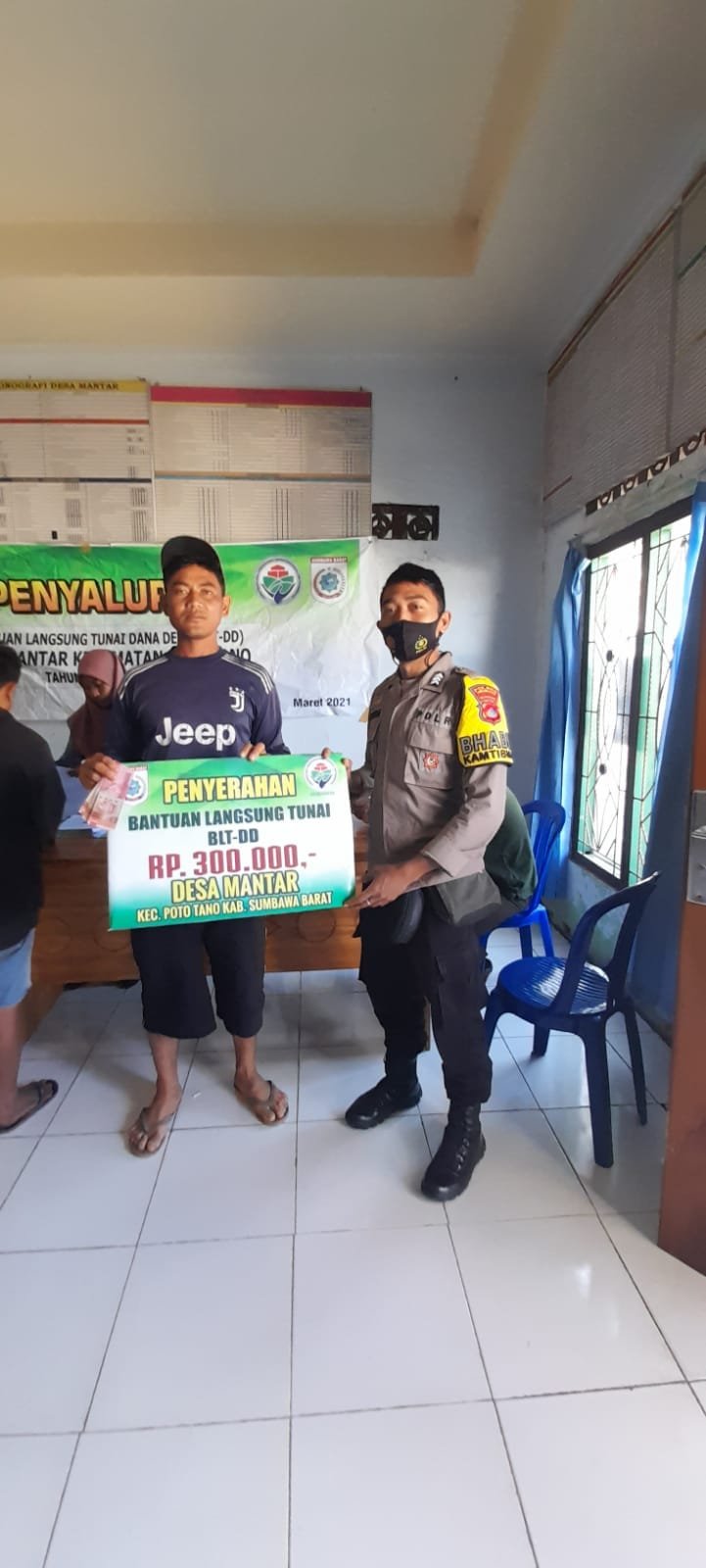 LENSAPOLRICOM, SUMBAWA BARAT – Bhabinkamtibmas Desa Mantar Kecamatan Poto Tano, Polsek Poto Tano Polres Sumbawa Barat Brigadir Zulharman Kurnia Putra mendampingi penyaluran bantuan langsung tunai (BLT) di kantor Desa Mantar