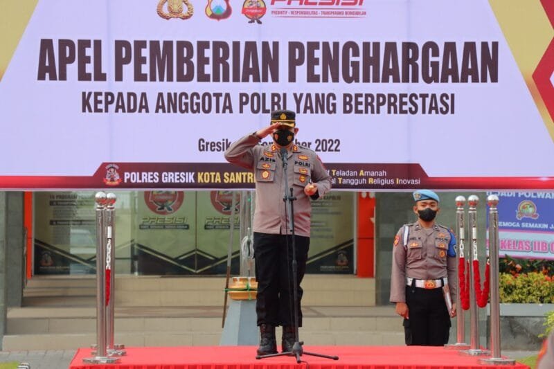 LENSAPOLRI.COM — GRESIK– Kapolres Gresik AKBP Mochamad Nur Azis memberikan apresiasi kepada 23 personelnya yang berhasil bekerja dengan baik. Penghargaan diberikan langsung saat memimpin apel di halaman Mapolres Gresik. Senin (5/9/2022).