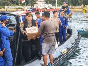Mereka bersama anggota membagi-bagikan sembako kepada warga nelayan ditengah laut menggunakan perahu.