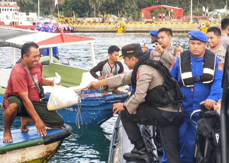 Mereka bersama anggota membagi-bagikan sembako kepada warga nelayan ditengah laut menggunakan perahu.