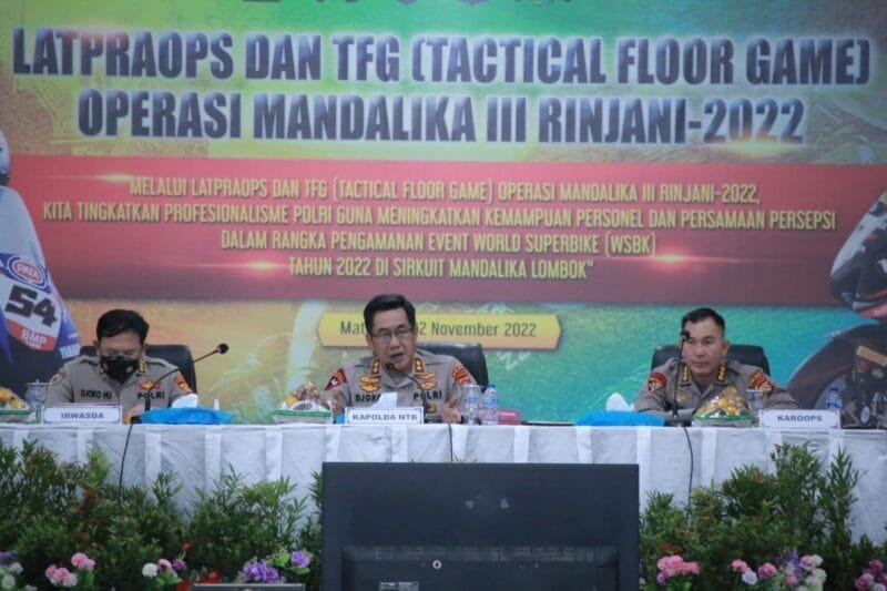 “Kita tidak berfikir sebarapa jumlah yang akan menonton atau yang mengunjungi Mandalika saat event WSBK, akan tetapi kita tetap melakukan pengamanan, kita tetap menjamin keamanan dan keselamatan para pengunjung Mandalika, oleh karenanya kita butuh kerjasama semua pihak terutama seluruh personil Polda NTB yang bertugas,”ungkap Kapolda NTB saat mengikuti Latpraops dan TFG Operasi Mandalika III Rinjani 2022, di Gedung Sasana Dharma Polda NTB, (02/11).
