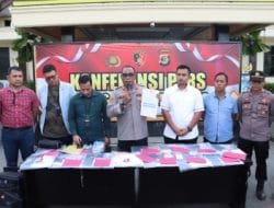 Tulang Bawang – Kapolres Tulang Bawang AKBP Hujra Soumena, SIK., MH., didampingi Kasat Reskrim AKP Wido Dwi Arifiya Zaen, SIK., MH., melaksanakan konferensi pers ungkap kasus kejahatan ITE kaitan link website BRI Mobile Palsu, tersangka dewasa 11 orang dan tersangka di bawah umur 2 orang, kegiatan bertempat di Mapolres Tuba, Selasa (15 November 2022).