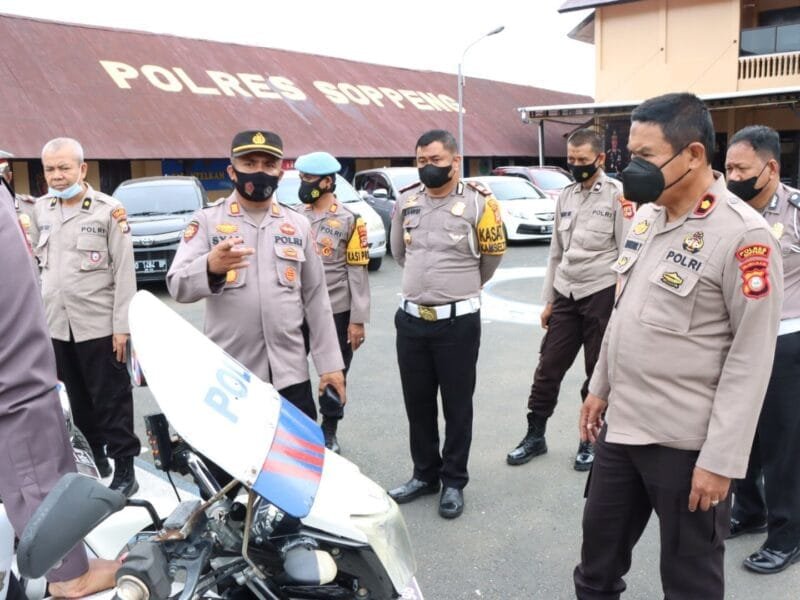 SOPPENG — Wakapolres Soppeng Kompol H. Muhiddin Yunus S.H M.H melaksanakan pengecekan dan pemeriksaan kendaraan dinas inventarisasi personil Sat Lantas Polres Soppeng di Halaman Apel Mako Polres Soppeng, Selasa 18 Januari 2022.