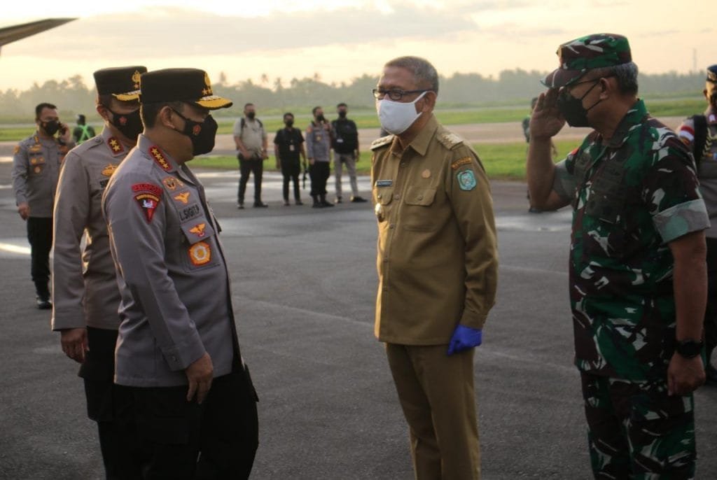 Kedatangan Kapolri Jenderal Pol Drs Listyo Sigit Prabowo dan Menkes RI Budi Gunadi Sadikin beserta rombongan ini disambut langsung oleh Gubernur Kalbar, Pangdam XII/Tanjungpura dan Kapolda Kalbar.
