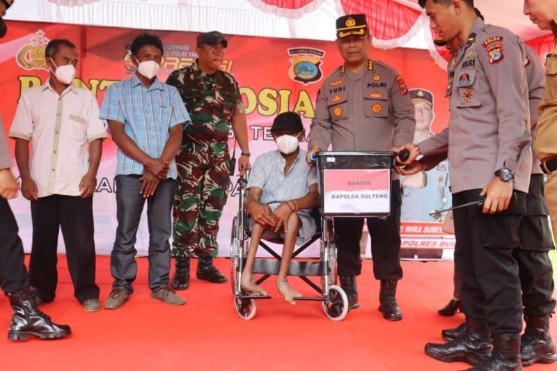 Setelah melakukan peninjauan pelayanan publik, Karo SDM yang didampingi Forkopimda selanjutnya secara simbolis menyerahkan bantuan Kapolda Sulteng berupa kursi roda kepada warga Kelurahan Buol, Kecamatan Biau yang mengalami cacat sejak lahir serta memberikan bantuan sembako ke warga yang membutuhkan.