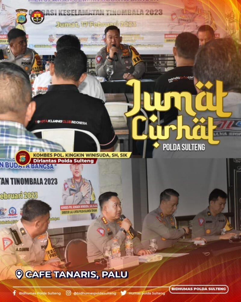 Mengangkat tema ‘Tertib Berlalu lintas Merupakan Cermin Budaya Bangsa’ Dirlantas Polda Sulteng Kombes Polisi Kingkin Winisuda, SH, SIK memimpin Jumat Curhat yang digelar di Cafe Tanaris Jalan Juanda, Palu, Jumat (17/2/2023)