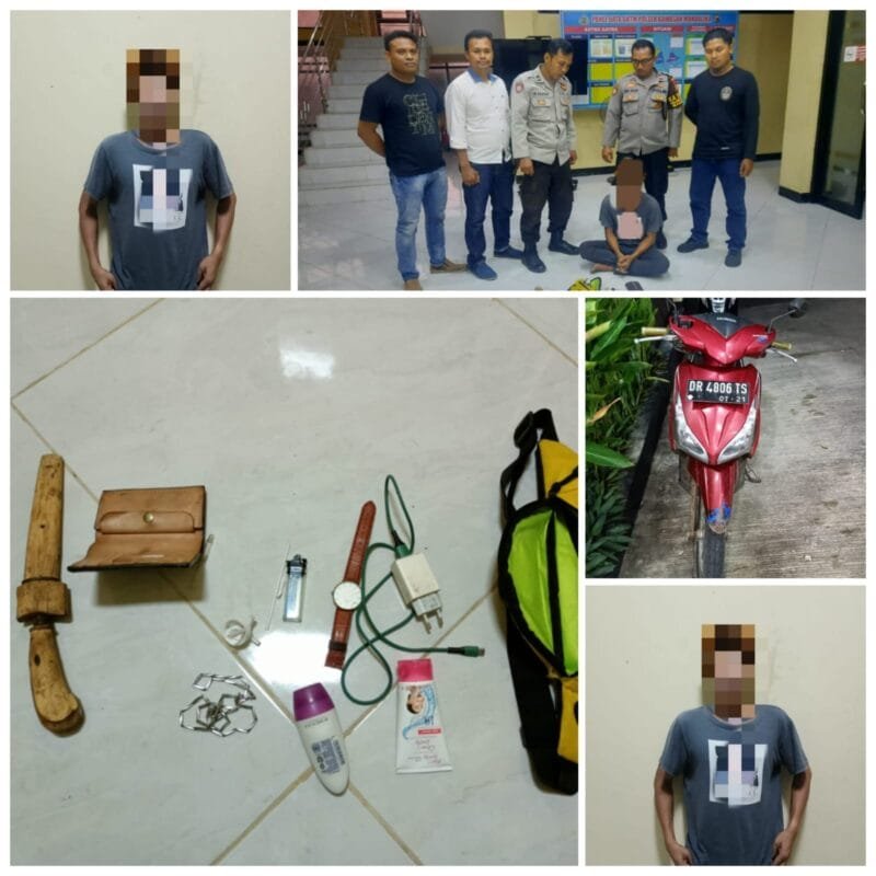 Saat dilakukan penangkapan dari tangan terduga pelaku diamankan barang barang berupa sebuah sepeda motor Honda jenis Vario warna merah dengan No Pol DR 4806 TS, sebilah pisau belati sepanjang 15 cm, alat hisap sabu, dompet berisi ATM BRI, 1 buah jam tangan dan 1 buah cas Merk Oppo.