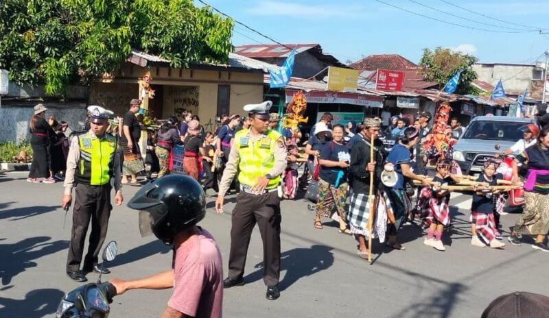 Mataram NTB – Anggota Polsek Sandubaya turut memberikan pengamanan Pawai Ogoh-ogoh Mini yang diselenggarakan siswa-siswi TK Cahaya Ananda Bagiratih Karang Taliwang, Kecamatan Cakranegara, Kota Mataram, (18/03/2023).