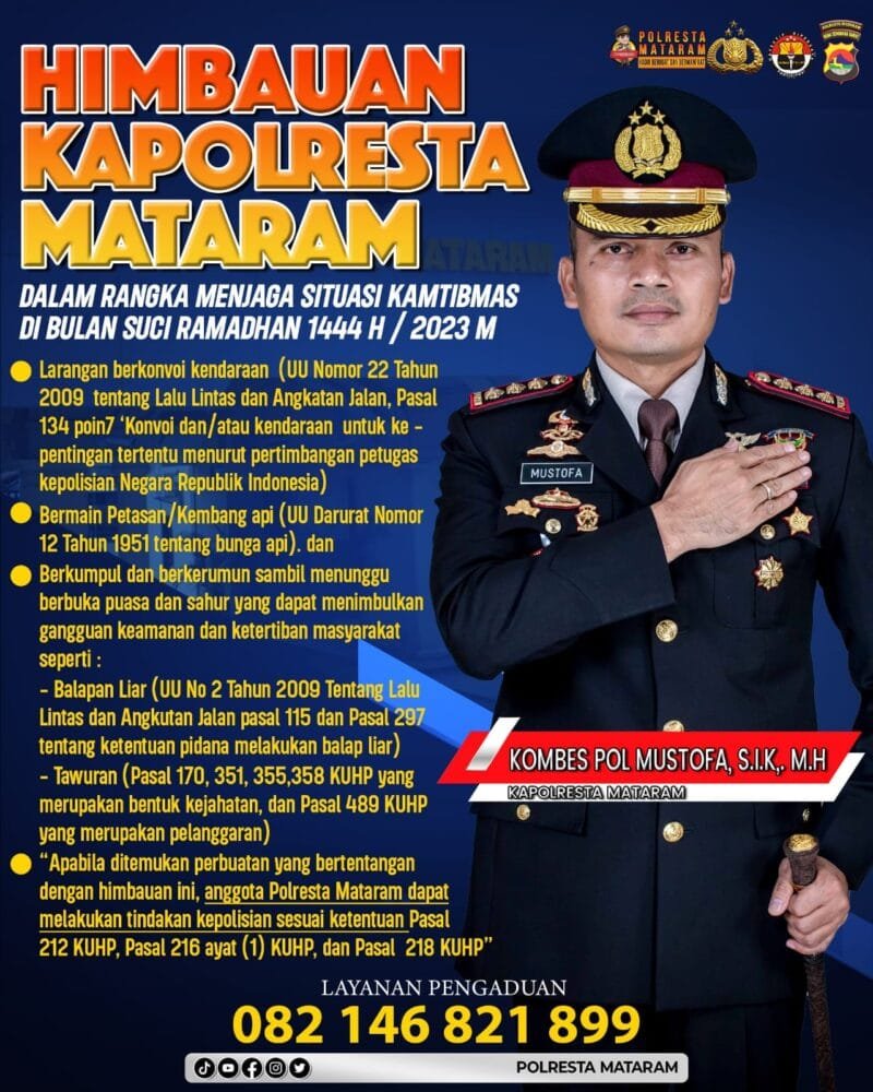 Dalam keterangannya saat di konfirmasi media ini terkait himbauan Polresta Mataram kepada masyarakat selama bulan suci Ramadhan 1444 H guna menjaga dan memelihara situasi dan kondisi Kamtibmas di kota Mataram, Kapolresta Mataram Kombes Pol Mustofa SIK MH, mengatakan bahwa memasuki bulan puasa beberapa himbauan Kamtibmas dikeluarkan oleh Polresta Mataram.