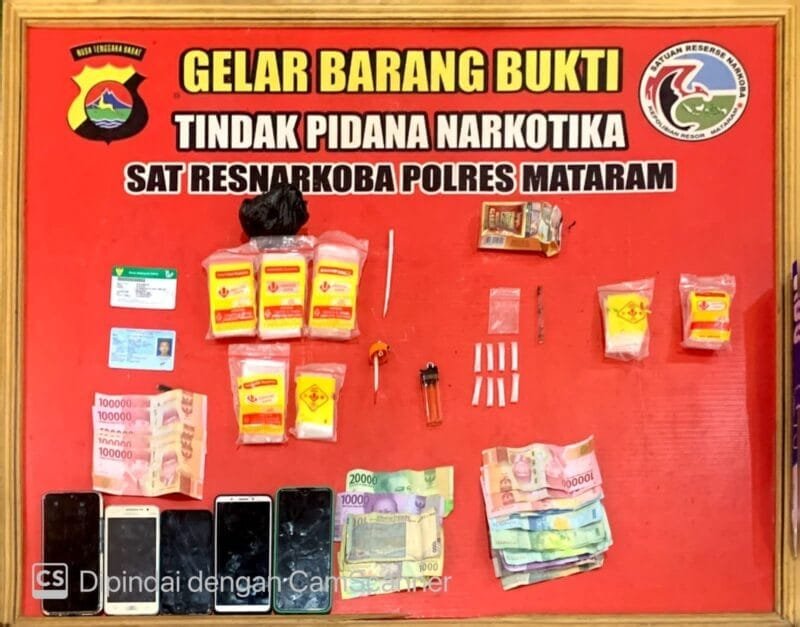 Dengan didampingi dan disaksikan oleh perangkat lingkungan setempat Anggota Opsnal Sat Resnarkoba Polresta Mataram melakukan penggeledahan badan dan disekitaran TKP diamankannya para terduga pelaku dan ditemukan barang bukti 1 buah bungkus rokok gudang garam surya di dalamnya terdapat 1 buah klip bening didalamnya berisikan 8 poket kristal bening diduga narkotika jenis shabu dengan berat bruto 2,5 Gram, alat konsumsi, alat komunikasi dan uang tunai Rp.1.166.000,-, jelasnya