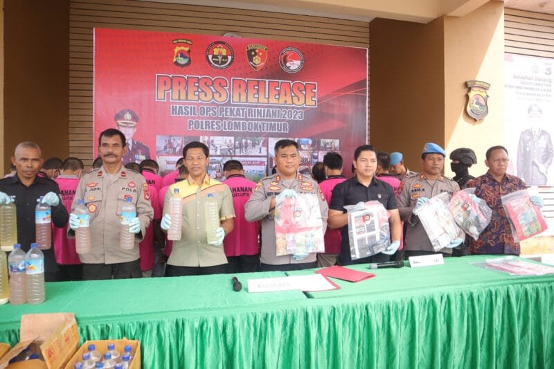 LOMBOK TIMUR, NTB – Polres Lombok Timur bersama jajaran telah melaksanakan Operasi Pekat (Penyakit Masyarakat) Rinjani 2023 di wilayah hukum Polres Lombok Timur. Dan pada hari ini, Kapolres Lombok Timur, AKBP Hery Indra Cahyono, SH., S.I.K., MH., didampingi Kasat Reskrim, Kasatresnarkoba, Kasat Tahti, Kasi Propam, dan Kasi Humas melakukan press release pengungkapan kasus hasil dari Operasi Pekat Rinjani 2023 tersebut bertempat di Mako Polres Lombok Timur, Jumat (31/3/23) Pukul 10.00 Wita.