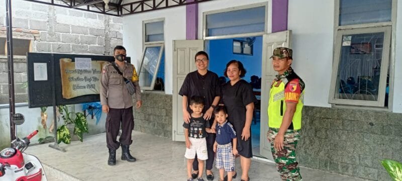 Blitar – Untuk memberikan rasa aman dan nyaman dalam rangka perayaan Paskah bagi umat Kristiani di wilayah binaan, Babinsa Koramil 0808/07 Ponggok Kodim 0808/Blitar Serda Chozin bersama Bhabinkamtibmas, melaksanakan pengamanan kegiatan peribadatan di Gereja Kristen Injil Nusantara (GKIN) Efrata, di Dusun Tegalrejo Desa Gembongan Kec. Ponggok Kab. Blitar, Jumat (7/4/2023).
