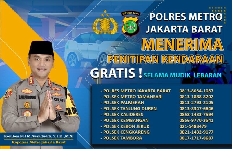 Kapolres Metro Jakarta Barat Kombes Pol M. Syahduddi menyampaikan bahwa untuk memberikan rasa aman bagi masyarakat jakbar yang akan melaksanakan mudik, pihaknya mempersilahkan warga masyarakat yang akan menitipkan kendaraan nya di kantor polisi akan dilayani selama 24 jam.