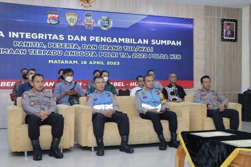 Mataram – Untuk mewujudkan Polri yang Presisi harus dimulai dari proses seleksi penerimaan terpadu anggota Polri tahun anggaran 2023 yang objektif, bersih, transparan, akuntabel dan humanis, Polresta Mataram melaksanakan Pakta Integritas dan Sumpah Panitia beserta peserta di Gedung Wira Pratama Polresta Mataram. Selasa, (18/04/2023)