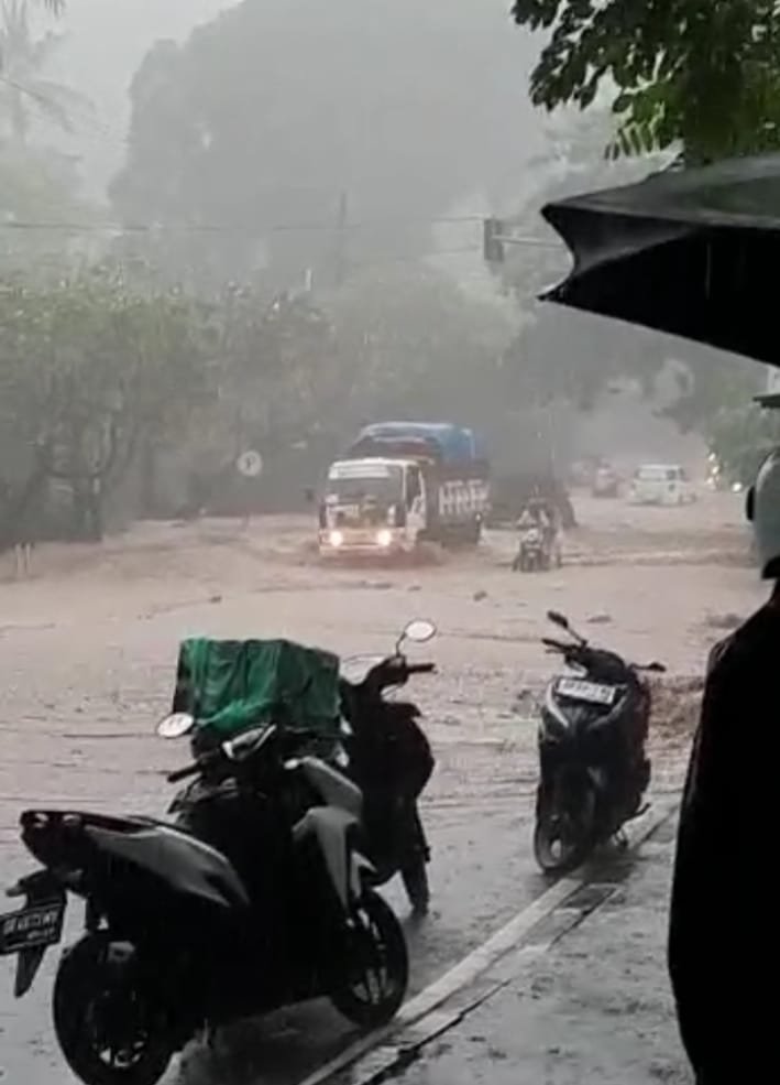 Bahkan sejumlah pengendara yang memaksa menerobos banjir mengalami mogok di depan cafe Sahara dan pertokoan lain nya Red,( BUKRAN )