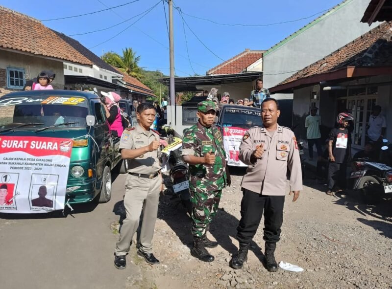 Majalengka, Ciptakan suasana aman, nyaman serta kondusif, Sinergi Kanit Samapta Polsek Sukahaji Polres Majalengka AIPTU Riyana Bersama Babinsa Koramil Sukahaji Kodim 0617/Majalengka melaksanakan monitoring dan pengamanan kampanye dalam rangka Pilkades (Pemilihan Kepala Desa) serentak di Desa Cikalong Kecamatan Sukahaji Kabupaten Majalengka, Senin (22/05/2023).