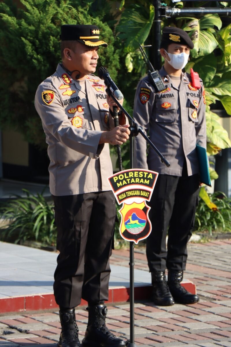 Mataram – Kepala Kepolisian Resor Kota Mataram Kombes Pol Mustofa SIK MH saat memberikan arahan pimpinan pada saat pelaksanaan Apel Pagi mengingatkan kembali kepada peesonelnya untuk mendorong Bhabinkamtibmas dan Polisi Lingkungan membantu data pemilih di wilayah binaannya.