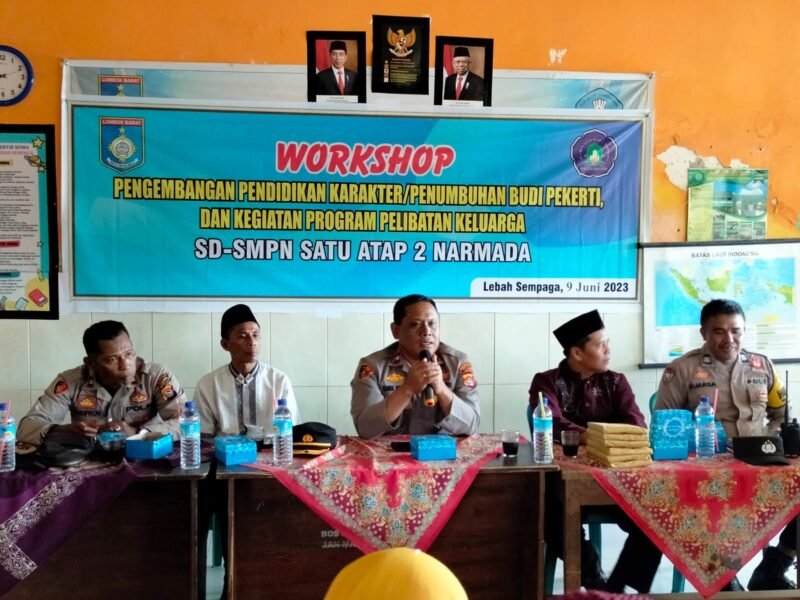 Lombok Barat – Dalam rangka ikut menyemarakkan Hari Bhayangkara ke 77 tahun 2023, Kapolsek Narmada Kompol Kadek Metria S.Sos, SH, MH berkolaborasi melaksanakan kegiatan Polisi Pelindung Perempuan dan Anak bekerjasama dengan Workshop Program Pelibatan Keluarga bertempat di Sekolah Satu Atap 2 Narmada Dusun Pesongoran Jukung, Desa Lebah Sepaga, Kecamatan Narmada Kabupaten Lombok Barat. Jumat, (09/06/2023)