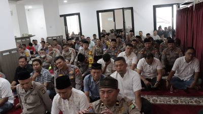 Sebanyak 200 personel Polres Metro Jakarta Barat dengan khidmat mendengarkan tausiyah yang diberikan oleh Ustadz Das’ad latief