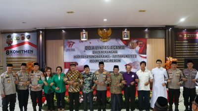 Cirebon- Polresta Cirebon menggelar doa bersama lintas agama dalam rangka Hari Bhayangkara ke-77 di Aula Pesat Gatra Mapolresta Cirebon, Senin (26/06/2023).