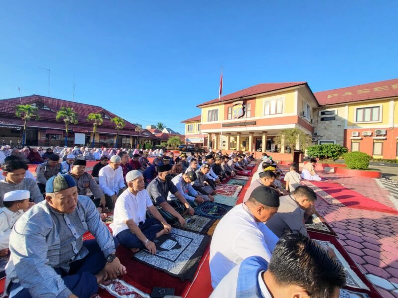 Paser – Kepolisian Resor Paser menggelar sholat Idul Adha 1444 Hijriah bertempat di halaman Mapolres Jl. Jenderal Sudirman, Kecamatan Tanah Grogot, Kabupaten Paser pada, Kamis (29/06/2023) pagi.