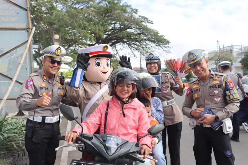 Masih kata Eryda, “Hari ini kita melibatkan 30 personel, gabungan, utamanya Sat Lantas. Jadi kita tempatkan personel untuk memberikan edukasi baik pemberian coklat, pembagian leaflet dan brosur serta helm keselamatan,” katanya.