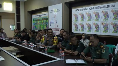 Majalengka- Wakapolres Majalengka, Kompol Bayu Purdantono, S.I.K., M.I.K, turut hadir dalam rapat persiapan rencana kunjungan kerja Pangdam III Siliwangi dan Kapolda Jabar ke wilayah Kabupaten Majalengka. Rapat persiapan ini berlangsung di Ruang Data Kodim 0617 Majalengka dan dipimpin oleh Kasdim 0617/Majalengka, Mayor Inf Yayat Nurhidayat.pada Senin (31/7/2023).