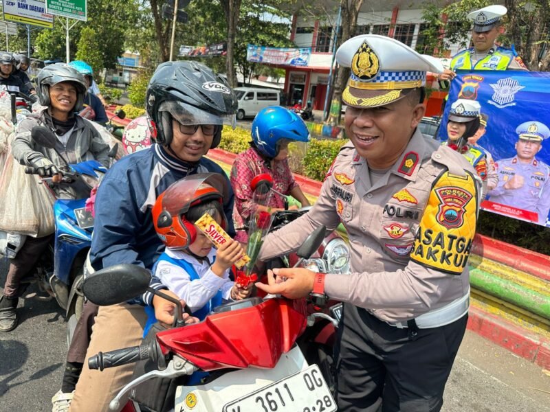 Jepara – Sat Lantas Polres Jepara membagikan coklat dan bunga kepada pengendara kendaraan di jalan raya yang mentaati aturan lalu lintas, Sabtu (16/9/2023).