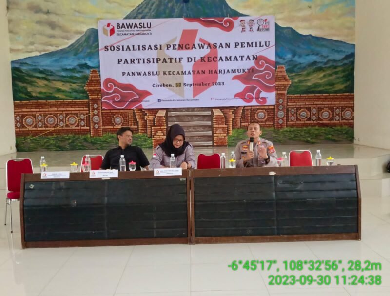 Polres Cirebon Kota- Badan Pengawas Pemilihan Umum (Bawaslu) Kota Cirebon beserta Panwas Kecamatan Harjamukti mengadakan kegiatan Sosialisasi Pengawasan Pemilu Partisipatif pada pemilu tahun 2024 yang dilaksanakan di Aula Kecamatan Harjamukti, Sabtu (30/9/23).