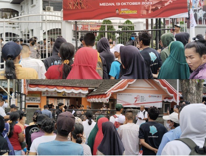 Sekitar 150 massa mahasiswa bersama masyarakat Kecamatan Medan Labuhan dan Medan Marelan, menggeruduk Kantor KPU dan Bawaslu Sumut, meminta pemeriksaan Surat Keterangan Tanda Tamat (SKTT) Sekolah Menengah Umum diduga palsu milik Caleg Mulia Asri Rambe alias Bayek, Senin (23/10/2023).