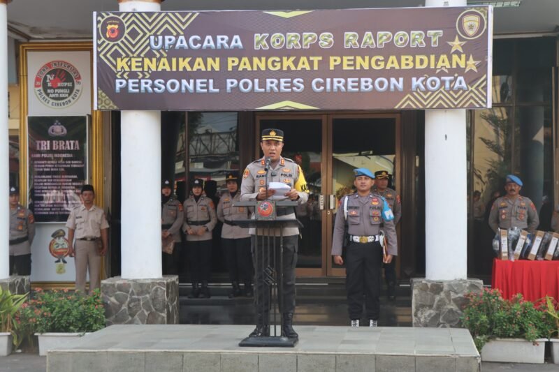 Cirebon Kota- Kepolisian Resor (Polres) Cirebon Kota menggelar Upacara Korps Raport Kenaikan Pangkat Pengabdian di Mapolres, Senin (6/11/23).