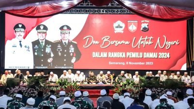 SEMARANG – Polda jateng menggelar doa bersama dalam rangka Pemilu damai 2024 di halaman Mapolda jateng, pada Rabu,(8/11/2023) malam.