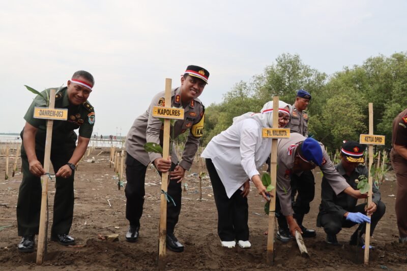 POLRES CIREBON KOTA,-Kepolisian Resor (Polres) Cirebon Kota menggelar penanaman sebanyak 100 pohon mangrove di Wisata Bahari Pantai Kejawanan Kota Cirebon, Rabu (15/11/23).